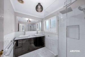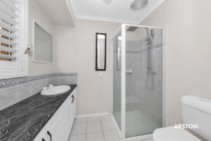 – Renovated main bathroom boasting a double Caesarstone vanity, shower, and a separate toilet.